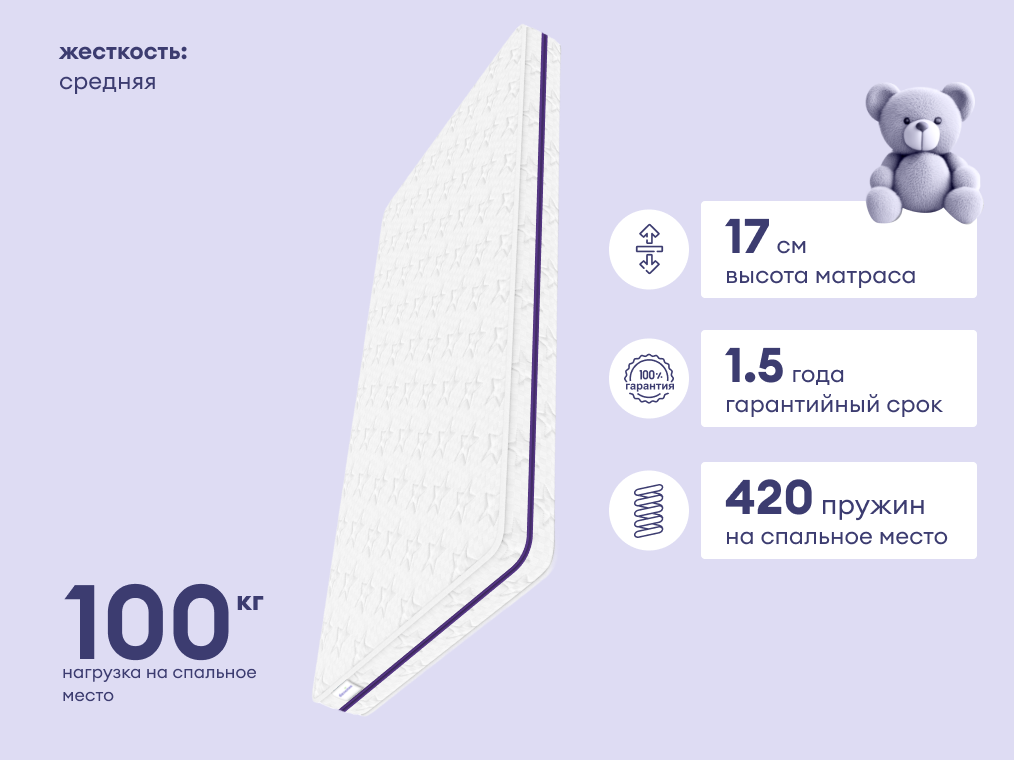 Базилик Бэби Мун – ортопедический комфорт с независимой поддержкой для детей разных возрастов. Матрас оснащён независимым пружинным блоком и рассчитан на нагрузку до 100 кг, что делает его подходящим как для маленьких детей, так и для подростков. Классическая средняя жёсткость и надёжные наполнители обеспечивают удобство и правильное положение позвоночника во время сна.