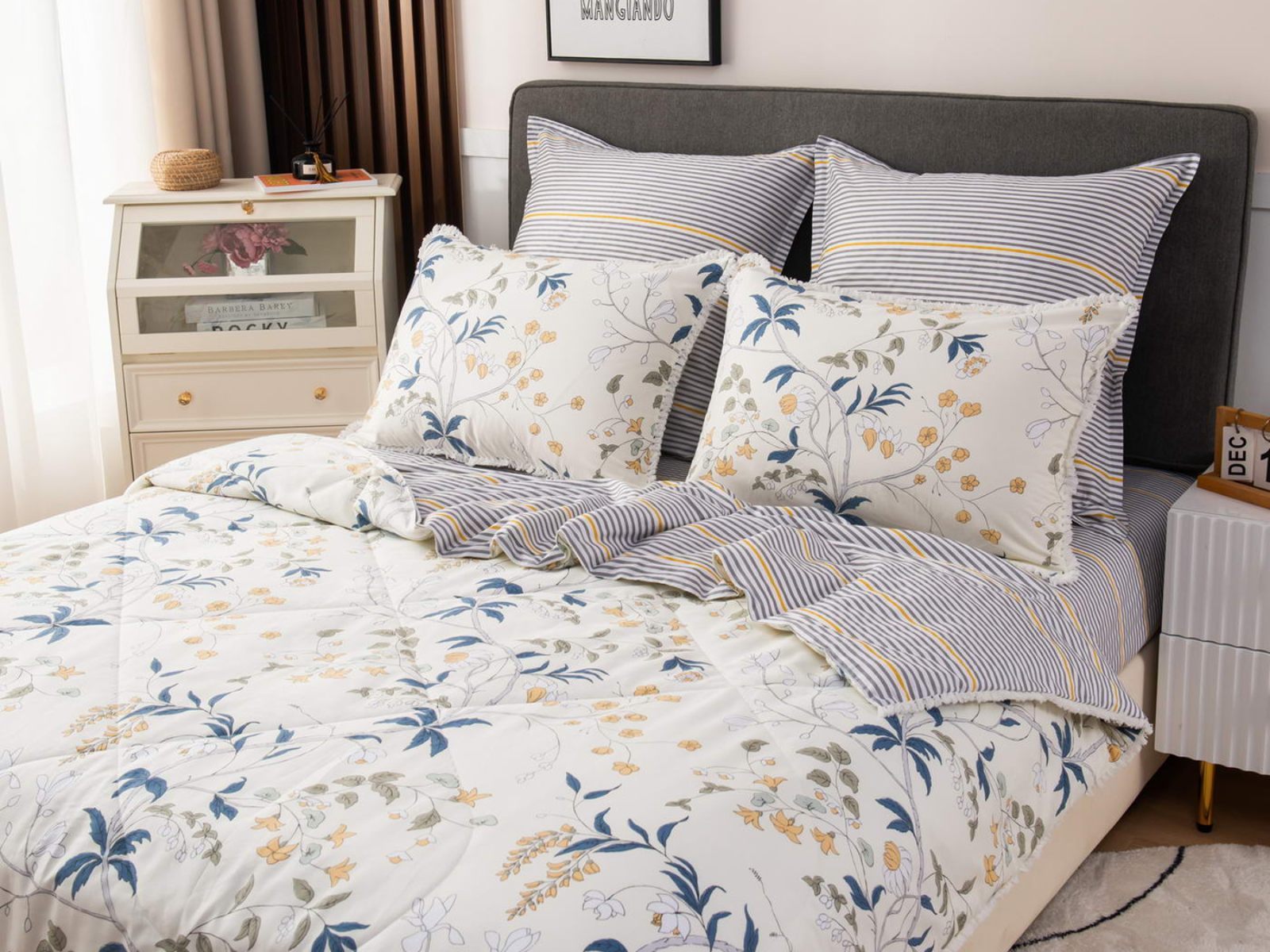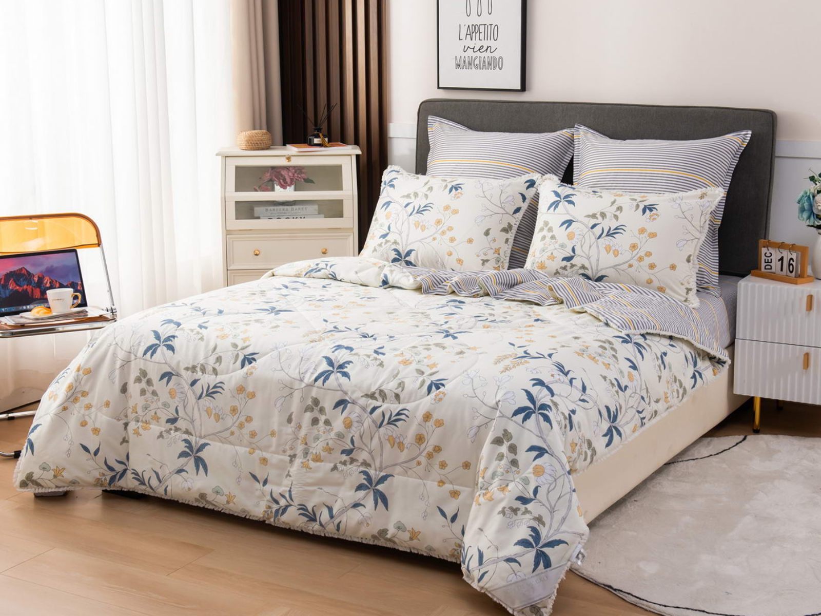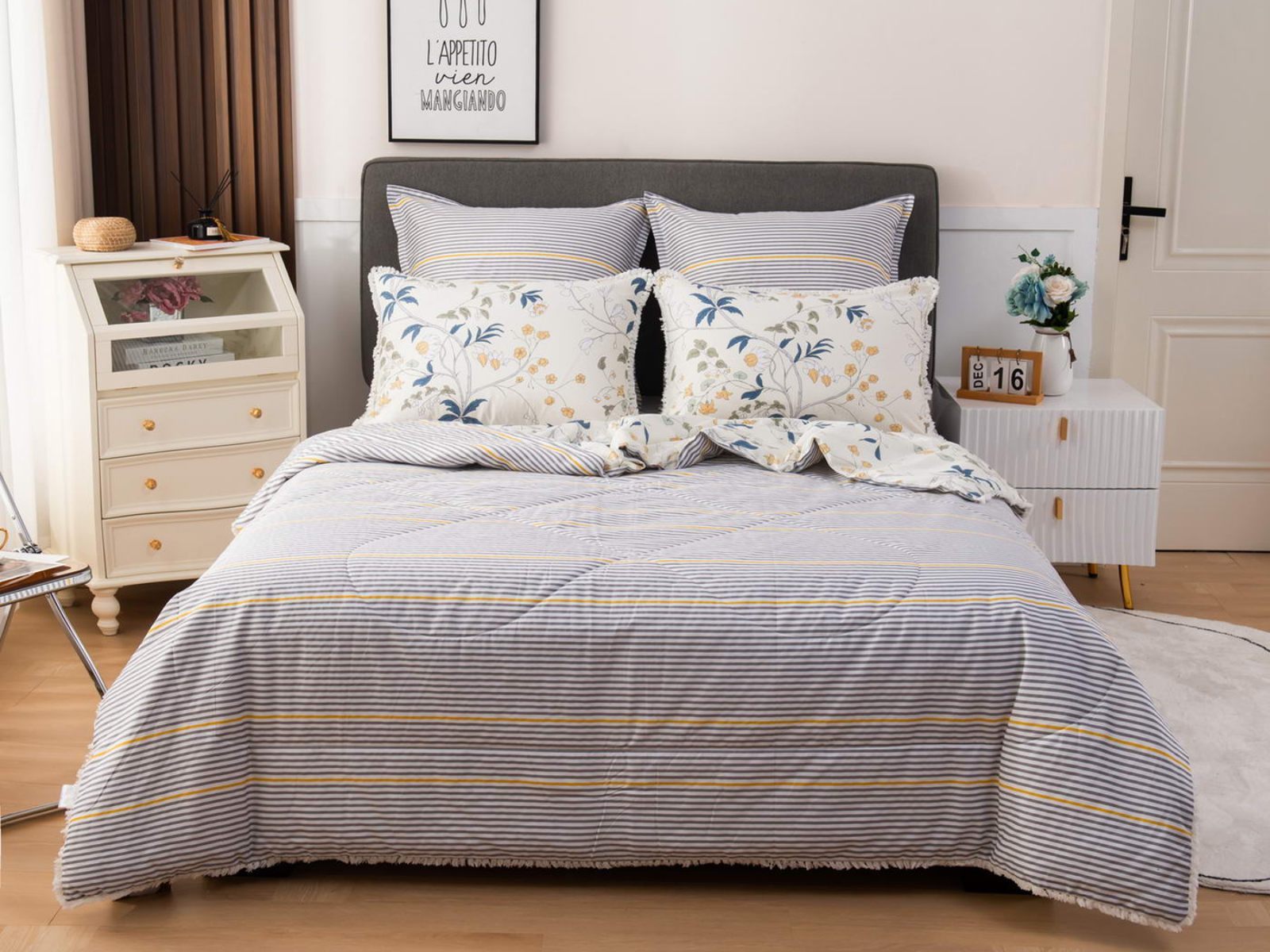 В комплекты комфортеров с одеялом Бернадетт входят наволочки, простыня и легкое всесезонное одеяло. Оцените это современное и очень удобное решение, которое идеально подходит тем, кто не любит возиться с пододеяльниками.
