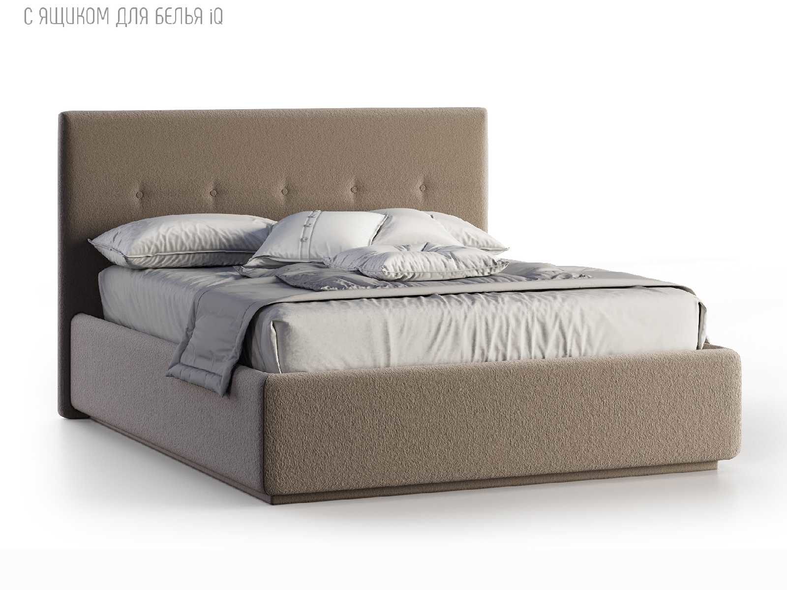 Кровать укомплектована IQ с подъемным механизмом и ящиком для белья без дна (дополнительная платная опция - дно к ящику IQ из HDF (ХДФ). Каркас кровати на цоколе, декоративный чехол на цоколе съёмный. Глубина ящика для белья - 30 см, без ограничения нагрузки на ящик.