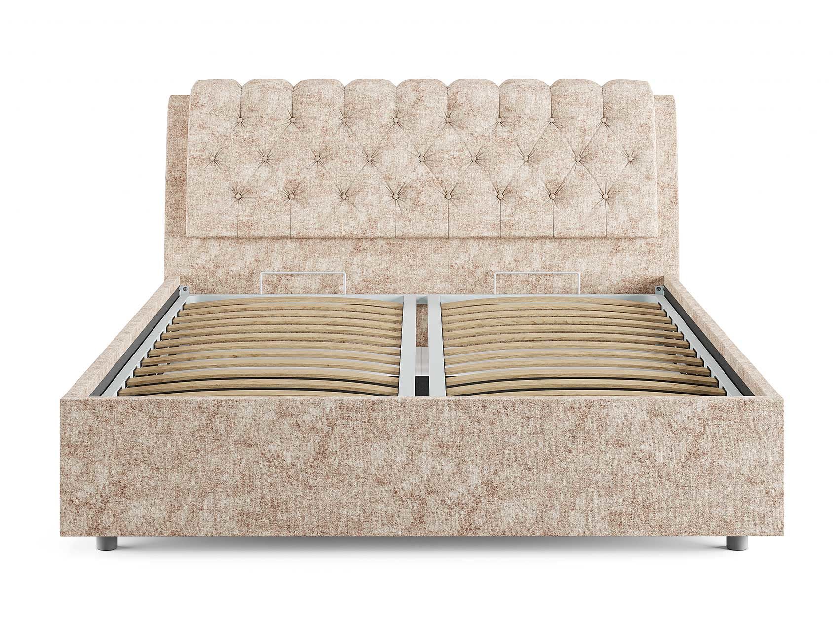 Кровать комплектуется металлическим основанием (без опор), которое имеет 13 рядов встроенных березовых ламелий на каждое спальное место, обеспечивая равномерное распределение нагрузки.