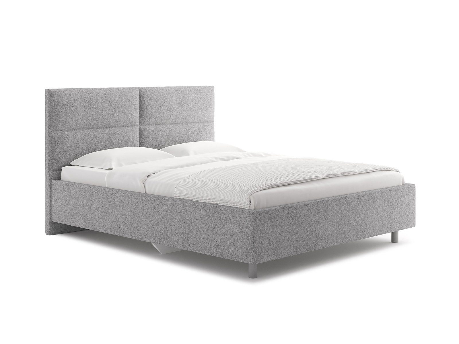 Лаконичная модель с изголовьем из объемных прямоугольников, сшитых между собой. Царги кровати выполняются по технологии съемного чехла. Модель изготовлена из ДСП. Обратная сторона изголовья обита спандбондом, но, при желании, её можно выполнить из основного обивочного материала.