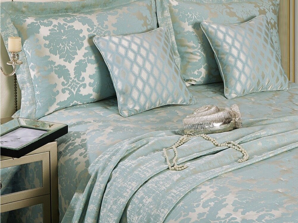 Шикарное покрывало с классическим итальянским рисунком мятного цвета на теплом серебристом фоне.