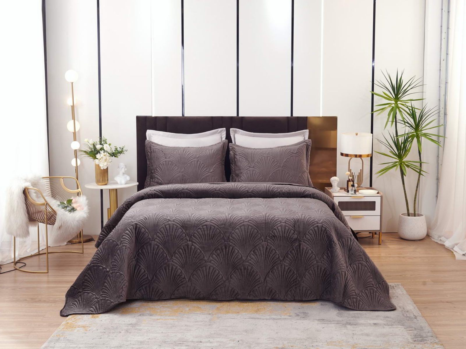 Роскошное велюровое покрывало Ариэль станет изюминкой любого интерьера, ведь оно потрясающе выглядит и приятное на ощупь. Обратите внимание на стежку покрывала – она выполнена в виде ракушек с эффектом 3D. Из-за особого плетения, велюровая ткань покрывала отражает свет и красиво переливается при различном освещении.