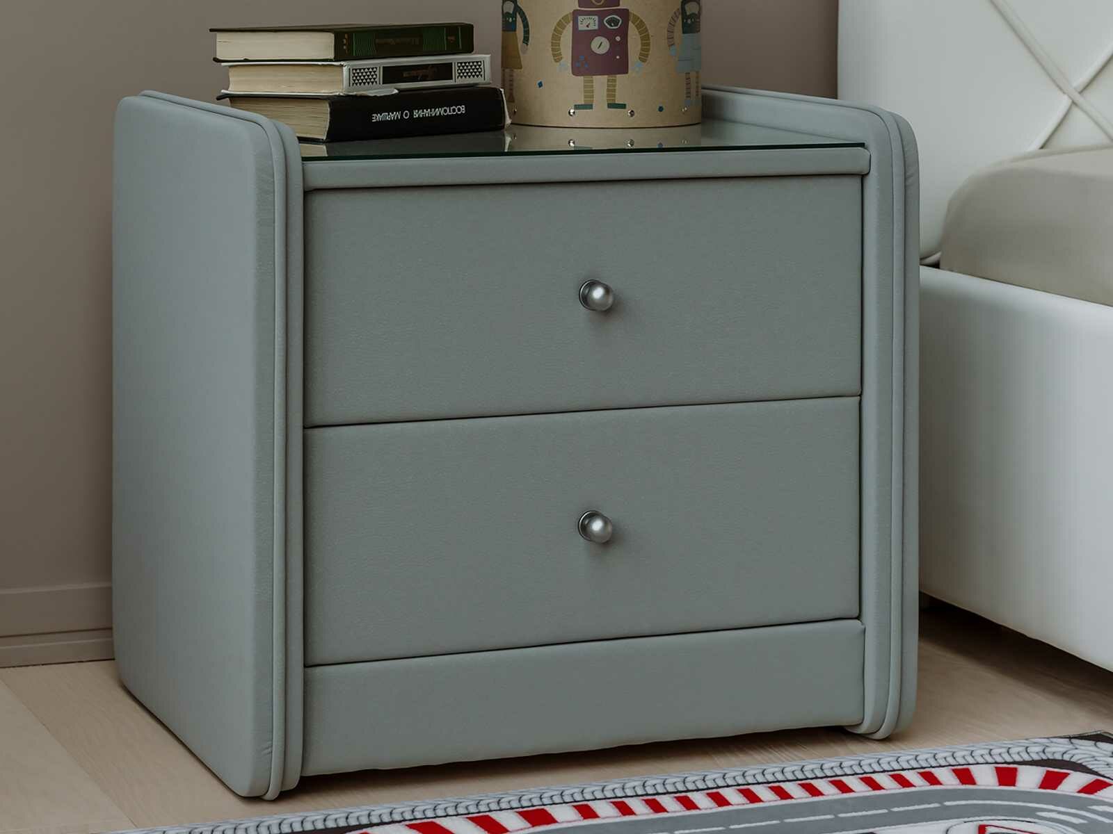 Тумба прикроватная Сандрига выполнена в изысканном классическом стиле. Обивка из высококачественного материала придает мебели особый шарм. Модель легко впишется в современные интерьеры и станет практичным дополнением меблировки спальни. На стеклянной столешнице расположится ночник, книга или чашка чая, а для необходимых под рукой мелочей предусмотрены два выдвижных ящика с ручками.