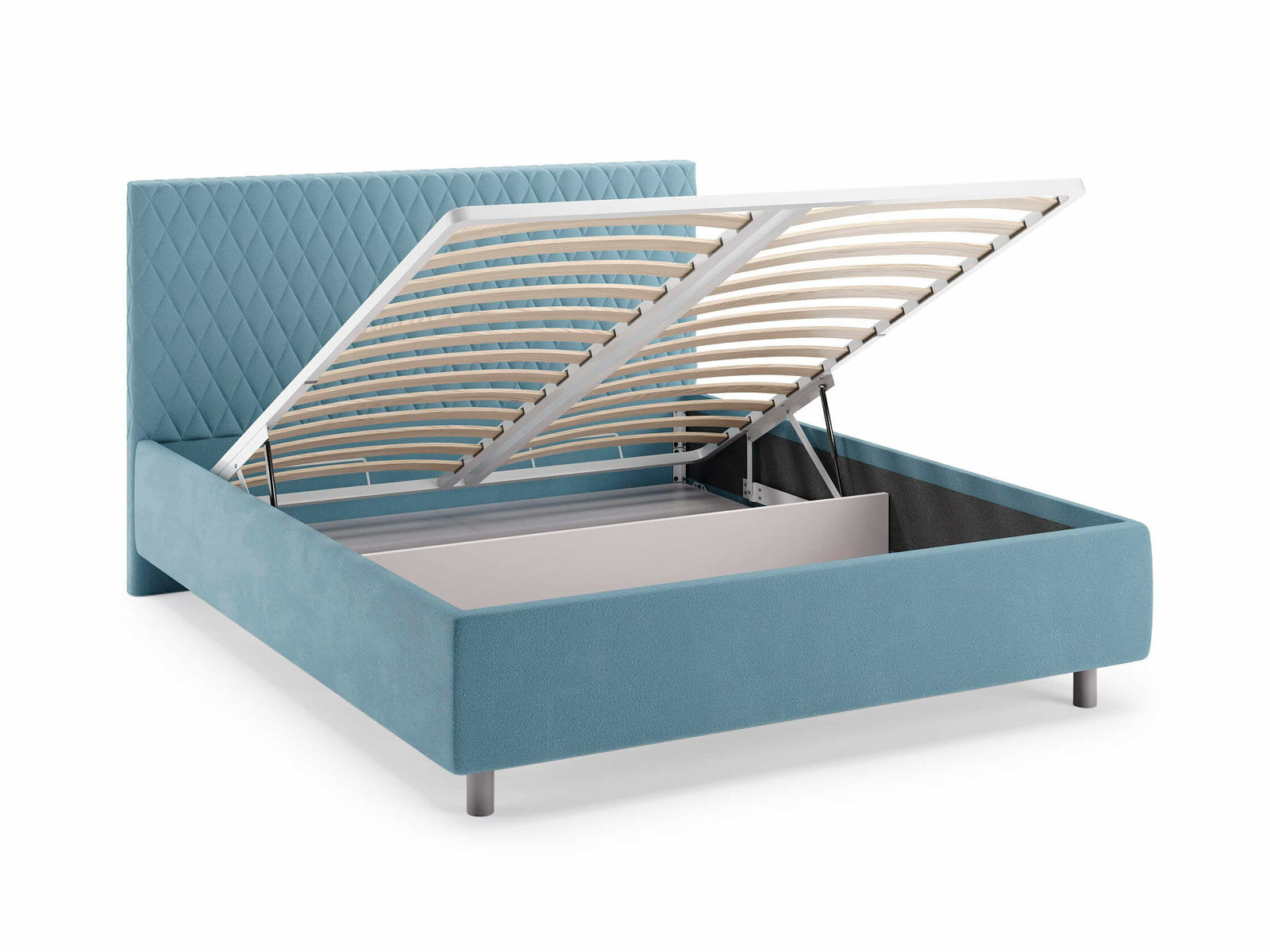 Кровать комплектуется металлическим основанием и подъемным механизмом со вместительным бельевым ящиком. Дно бельевого ящика легко сдвигается для обеспечения уборки под кроватью.
